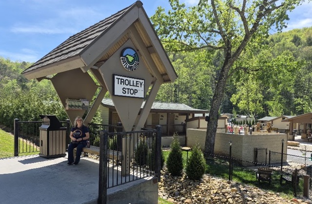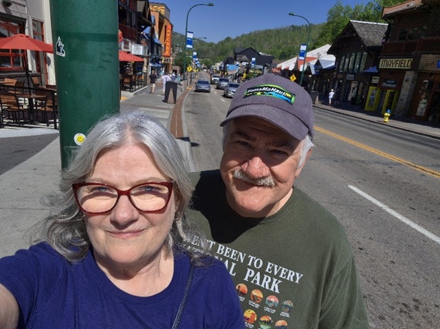 After the drive through Chattanooga & Knoxvile (TN), we arrived in our spot at Dudley Creek RV Resort near Gatlinburgnear the Great Smoky Mountains National Park. After supper each day, we enjoy an evening stroll around Dudley Creek RV Resort.We’re within a very short walking distance of the TomsMaHaul.com motorhome enjoying a great 47th anniversary dinner at Crystelle Restaurant & Grill.Tom captures a photo of Teri at Dudley Creek, which is located right behind several RV spots.We were told that if the black bears roam near our site, to clap & they’ll go away.Teri captures our photo while we strolled around Gatlinburg (TN). We’re told that we are here at a good time (April), because beginning May 1st, through early Fall, Gatlinburg & Pigeon Forge gets packed w/ tourists.The free trolley rides are a great way to get around Gatlinburg. This trolley stop was at the entry to Dudley Creek RV Resort & less than 50 yards from our motorhome. Nice ride w/ an informative Trolley driver. Tips are appreciated. There’s an phone app to track the trolleys locations.