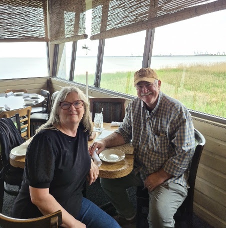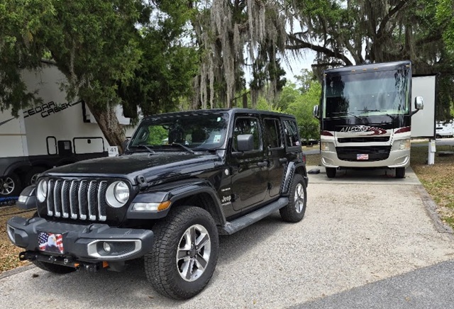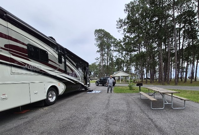 Tom drove us from Berwick, through Houma, New Orleans, Biloxi & Mobile. Cruised along at 65-68mp near the coast of the Gulf of America. Just a few 20 minute traffic delays along I-10. After a fuel stop in Mobile (AL), there was another 12 minutes of driving, before arriving at Meaher State Park-Alabama. Very roomy RV site that are large & level. To wrap up the day, we decided that we deserved a relaxing dinner at Felix’s Fish Camp (5 minutes down the road).After arriving at Meaher State Park-Alabama in Spanish Fort (near Mobile), we drove the Jeep to the, nearby, Felix’s Fish Camp & enjoyed an EXCELLENT dining experience. Very tasty food & great service. Beautiful view of the causeway/bay & in the distance we could see the U.S.S. Alabama.