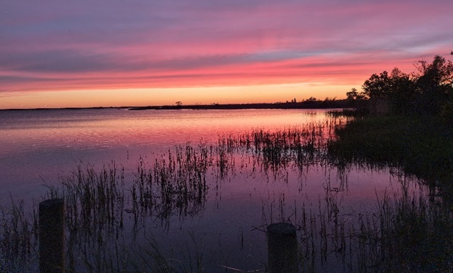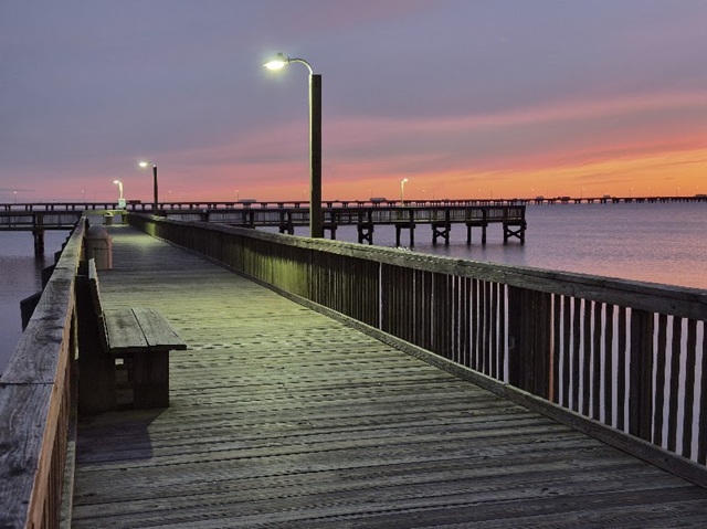 At the end of a travel day, and great dinner, we relaxed around the TomsMaHauL motorhome & enjoyed a stroll around the park when Teri captured a few photos a beautiful sunset (below). In the background of the dock photo is the long I-10 bridge. We’ve crossed that bridge many times for several years, & would always mention that we’d stay at this park, someday. Someday finally arrived.
